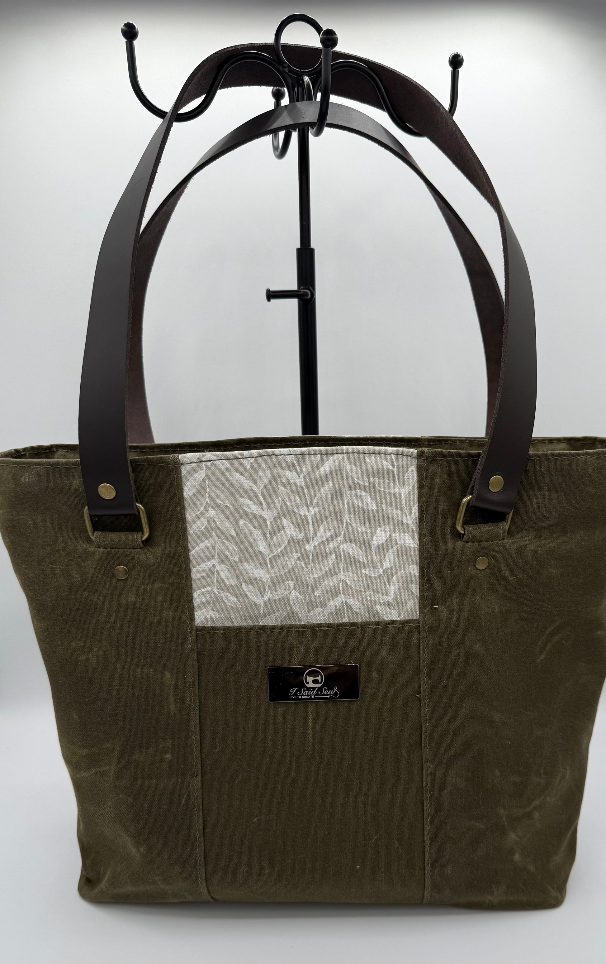 Experience style and functionality with the Julie Tote! The Khaki and Blue patterned Vinyl exterior adds a unique touch, while the navy blue waterproof canvas interior keeps your belongings safe. With external and internal slip pockets, as well as a zipper closure and pockets, this tote is perfect for any occasion.